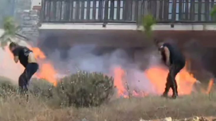 Συγκλονιστικές είναι οι εικόνες από τους Θρακομακεδόνες όπου μαίνεται αυτή την ώρα η φωτιά και όπου οι πυροσβεστικές δυνάμεις έχουν ρίξει το βάρος για να μπορέσουν να την θέσουν υπό έλεγχο. Στα πλάνα που μετέδωσε ο ΣΚΑΪ, φωτιά “άρπαξε” η αυλή ενός σπιτιού, η οποία είχε ξερά χόρτα, ενώ οι καύτρες κατευθύνονται παντού. Αστυνομικοί και εθελοντές, αλλά και κάτοικοι της περιοχής προσπαθούν να σβήσουν τις φλόγες με ξεροκλάδια. Παράλληλα, αστυνομικός ενημέρωνε τον ηλικιωμένο κύριο που βρισκόταν μέσα στο σπίτι ότι θα πρέπει να αποχωρήσει. Παράλληλα, άτομα φώναζαν τους γονείς τους.