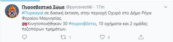 Συναγερμός σήμανε το μεσημέρι της Δευτέρας από πυρκαγιά σε δασική έκταση, στην περιοχή Οχυρό στο Δήμο Ρήγα Φεραίου Μαγνησίας. Κινητοποιήθηκαν άμεσα 30 πυροσβέστες με 10 οχήματα, ενώ στην περιοχή έσπευσαν και 2 ομάδες πεζοπόρων τμημάτων για να συνδράμουν στην επιχείρηση κατάσβεσης της φωτιάς.