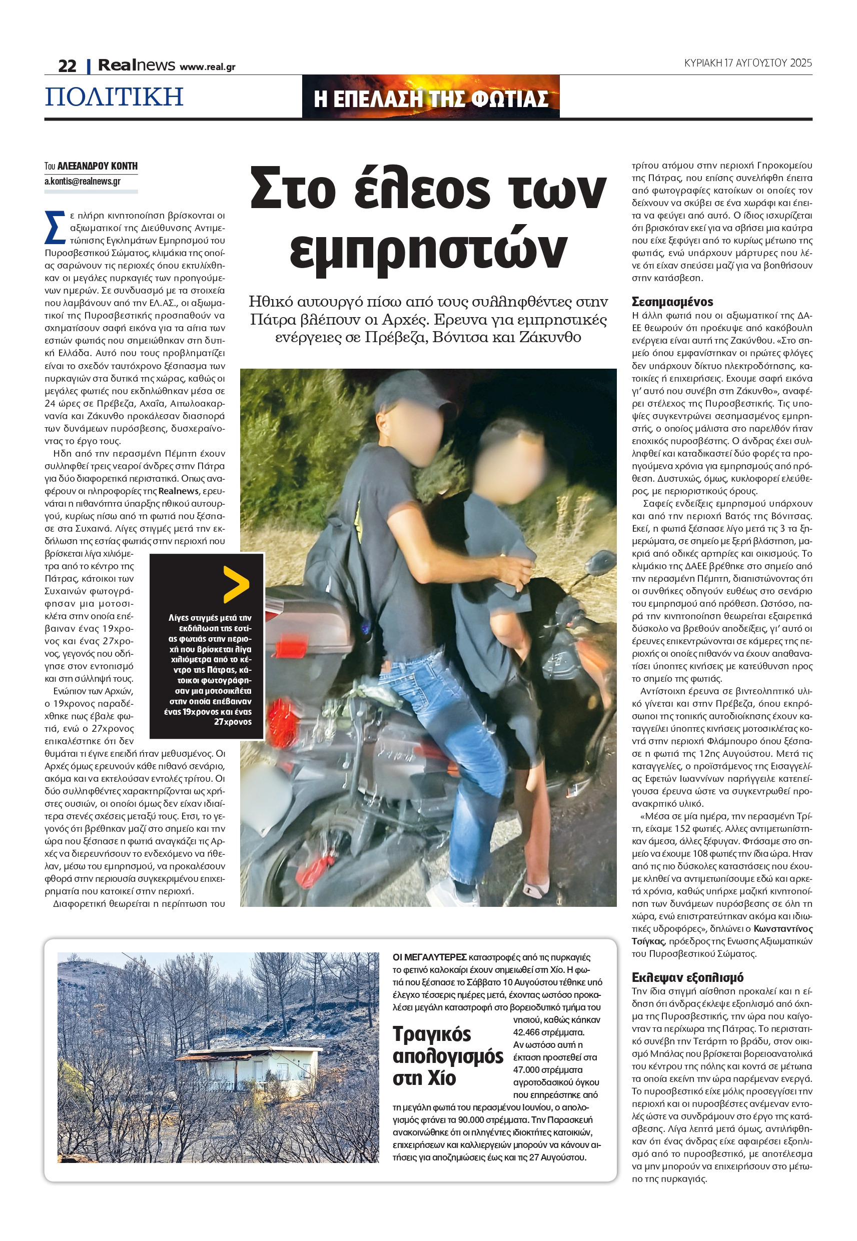 Ηθικό αυτουργό πίσω από τους συλληφθέντες στην Πάτρα βλέπουν οι Αρχές. Ερευνα για εμπρηστικές ενέργειες σε Πρέβεζα, Βόνιτσα και Ζάκυνθο.