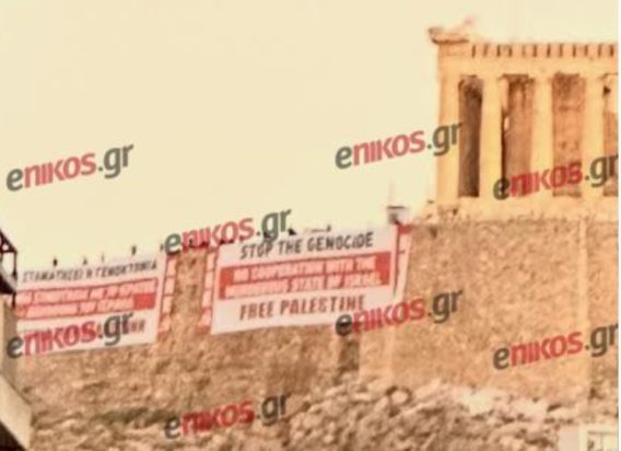 Δύο πανό που αναφέρουν, μεταξύ άλλων, «Stop the genocide» και «Free Palestine» έχουν αναρτηθεί στην Ακρόπολη, από μέλη του ΚΚΕ και της ΚΝΕ, όπως μπορείτε να δείτε σε φωτογραφία που έστειλε αναγνώστης του enikos.gr.