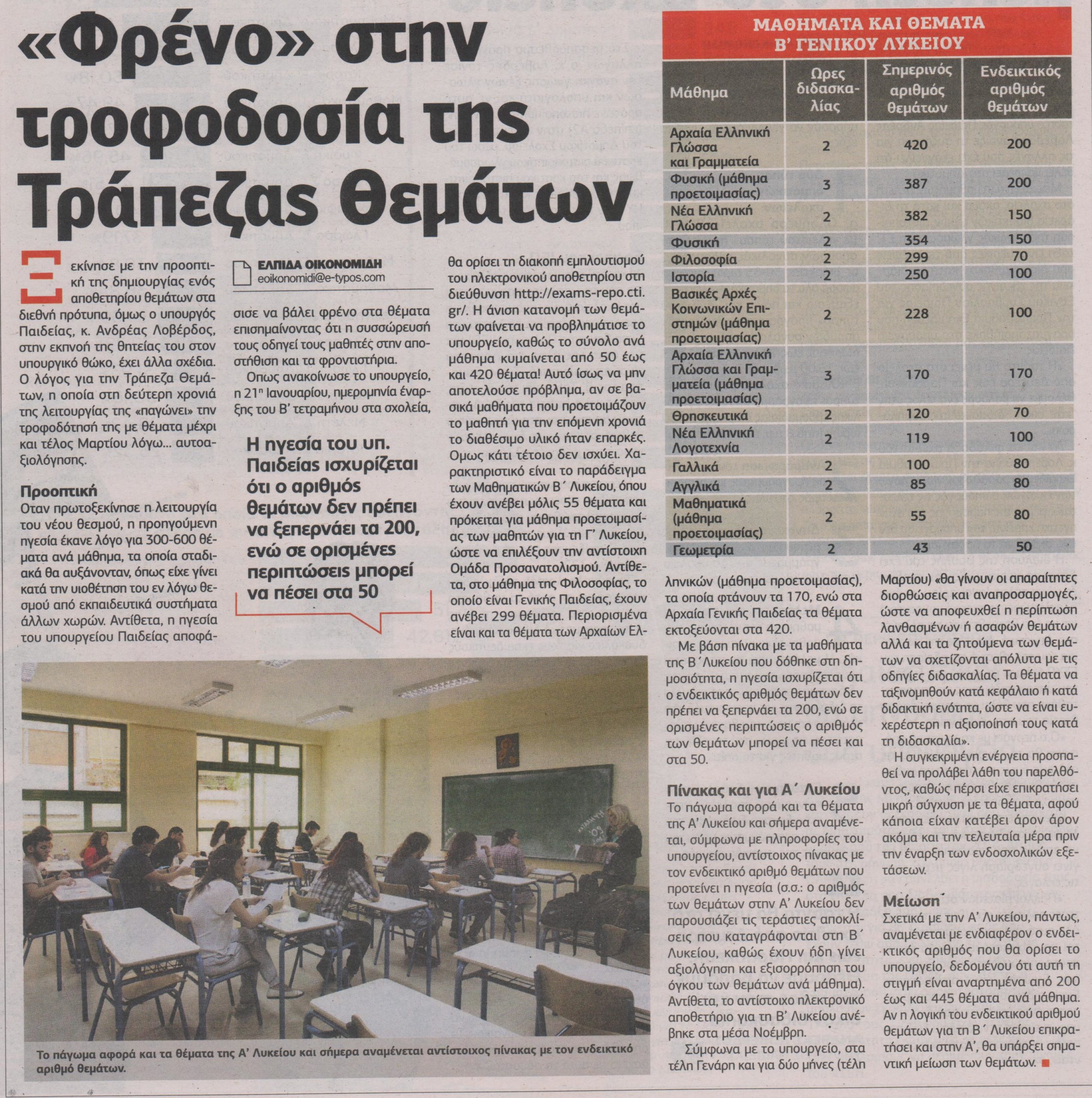 Όταν πρωτοξεκίνησε η λειτουργία του νέου θεσμού, η προηγούμενη ηγεσία έκανε λόγο για 300-600 θέματα ανά μάθημα, τα οποία σταδιακά θα αυξάνονταν, όπως είχε γίνει κατά την υιοθέτησή του εν λόγω θεσμού από εκπαιδευτικά συστήματα άλλων χωρών. Αντίθετα, η ηγεσία του υπουργείου Παιδείας αποφάσισε να βάλει φρένο στα θέματα επισημαίνοντας ότι η συσσώρευσή τους οδηγεί τους μαθητές στην αποστήθιση και τα φροντιστήρια.