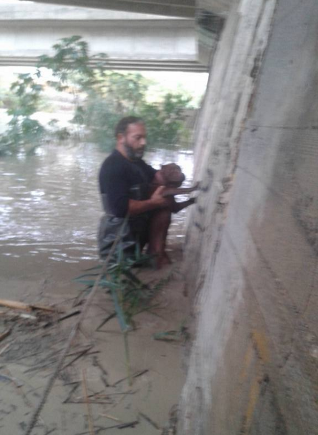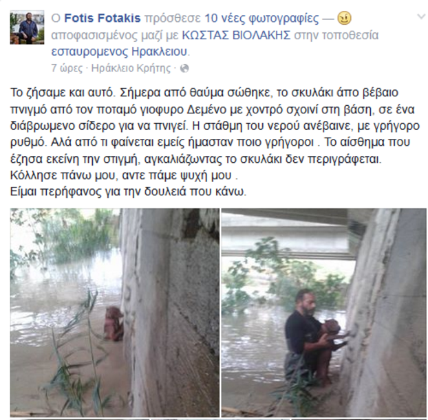 Ωστόσο, δύο υπάλληλοι του Δημοτικού Κυνοκομείου Ηρακλείου, έδειξαν την ευαισθησία τους και δεν δίστασαν με κίνδυνο ακόμη και της ίδιας τους της ζωής, να βουτήξουν στα ορμητικά νερά του Γιόφυρου για να απελευθερώσουν το σκυλί που μάταια προσπαθούσε να κόψει τα δεσμά του. Ο ένας από τους δύο άντρες ανήρτησε στον προσωπικό του λογαριασμό στο facebook φωτογραφίες από την επιχείρηση διάσωσης του σκυλιού.