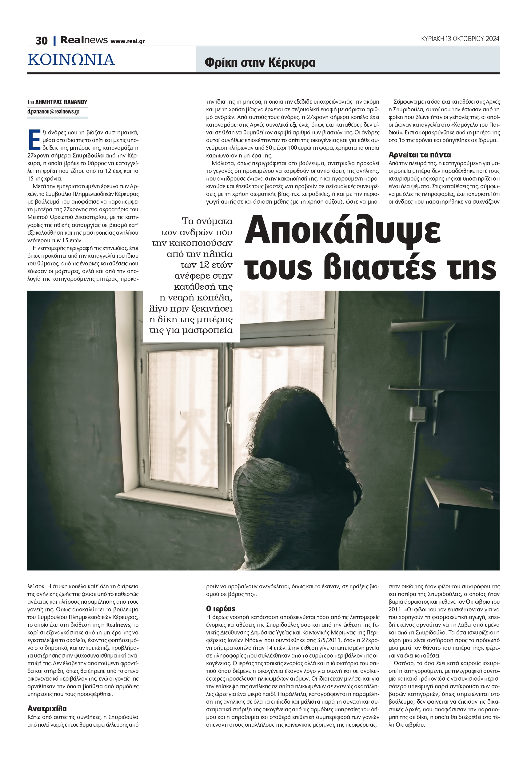 Eξι άνδρες που τη βίαζαν συστηματικά, μέσα στο ίδιο της το σπίτι και με τις υποδείξεις της μητέρας της, κατονομάζει η 27χρονη σήμερα Σπυριδούλα από την Κέρκυρα, η οποία βρήκε το θάρρος να καταγγείλει τη φρίκη που έζησε από τα 12 έως και τα 15 της χρόνια. Μετά την εμπεριστατωμένη έρευνα των Αρχών, το Συμβούλιο Πλημμελειοδικών Κέρκυρας με βούλευμά του αποφάσισε να παραπέμψει τη μητέρα της 27χρονης στο ακροατήριο του Μεικτού Ορκωτού Δικαστηρίου, με τις κατηγορίες της ηθικής αυτουργίας σε βιασμό κατ’ εξακολούθηση και της μαστροπείας ανηλίκου νεότερου των 15 ετών.