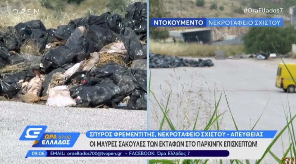 Απαράδεκτες εικόνες έξω από το νεκροταφείο του Σχιστού, όπου στοιβάζονται υπολείμματα από τις εκταφές των νεκρών.Σύμφωνα με ρεπορτάζ της πρωινής εκπομπής του OPEN, αντί να τηρείται η σχετική διαδικασία που προβλέπεται για τις εκταφές, τα υπολείμματα μπαίνουν σε μαύρες σακούλες και πετάγονται στο πάρκινγκ επισκεπτών του νεκροταφείου. Στους διαδρόμους δε του κοιμητηρίου, υπάρχουν επίσης μαύρες σακούλες με υπολείμματα από τις εκταφές.