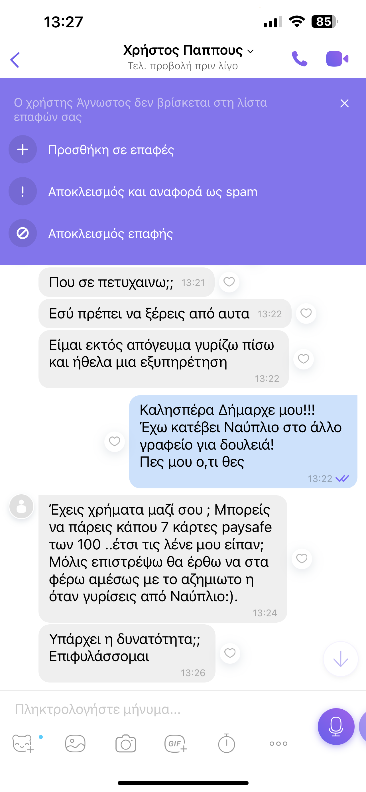«Έχεις χρήματα μαζί σου; Μπορείς να πάρεις κάπου 7 κάρτες paysafe των 100 ευρώ…έτσι τις λένε μου είπαν; Μόλις επιστρέψω θα έρθω να στα φέρω αμέσως με το αζημίωτο ή όταν γυρίσεις από Ναύπλιο»