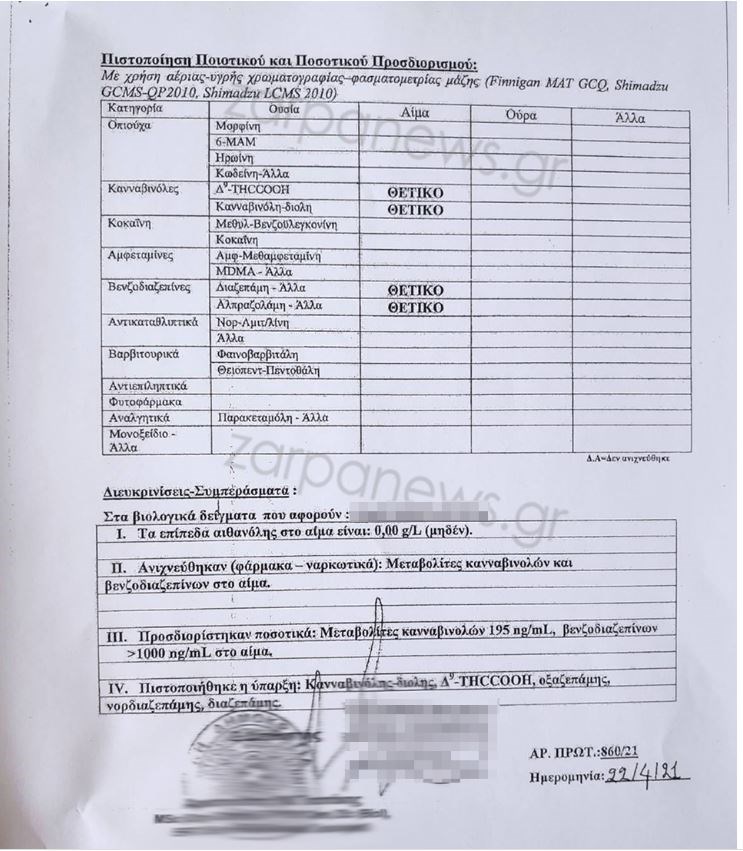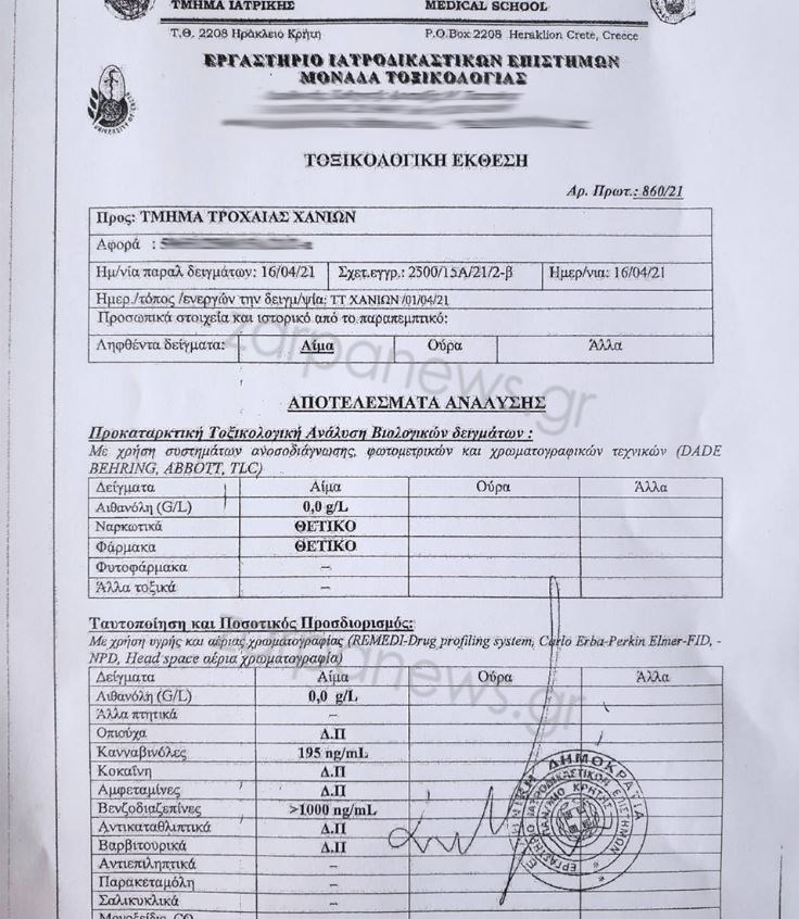 Νέα δεδομένα και στοιχεία βλέπουν το φως της δημοσιότητας σχετικά με το τροχαίο στη Γαύδο που κόστισε τη ζωή στην Κορίνα, ενώ την ίδια ώρα η οικογένειά της ζητεί να αποκαλυφθεί η αλήθεια για τον θάνατο του παιδιού της. Οι τοξικολογικές εξετάσεις του οδηγού του οχήματος που επιβίωσε και τις οποίες δημοσιεύει το zarpanews.gr, δείχνουν πως υπήρξαν μεταβολιτές στο αίμα του που προέρχονται από ναρκωτικές ουσίες στον οργανισμό του, τόσο κανναβιδοειδών, όσο και άλλων ουσιών που παραπέμπουν σε ναρκωτικά χάπια.