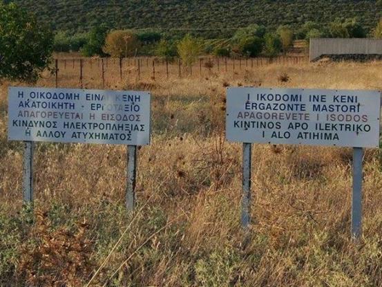 Με άπταιστα greeklish δίνεται προειδοποίηση για το εργοτάξιο το οποίο πρέπει να προσέχουν όσοι βρίσκονται στο σημείο διότι υπάρχει κίνδυνος ηλεκτροπληξίας.