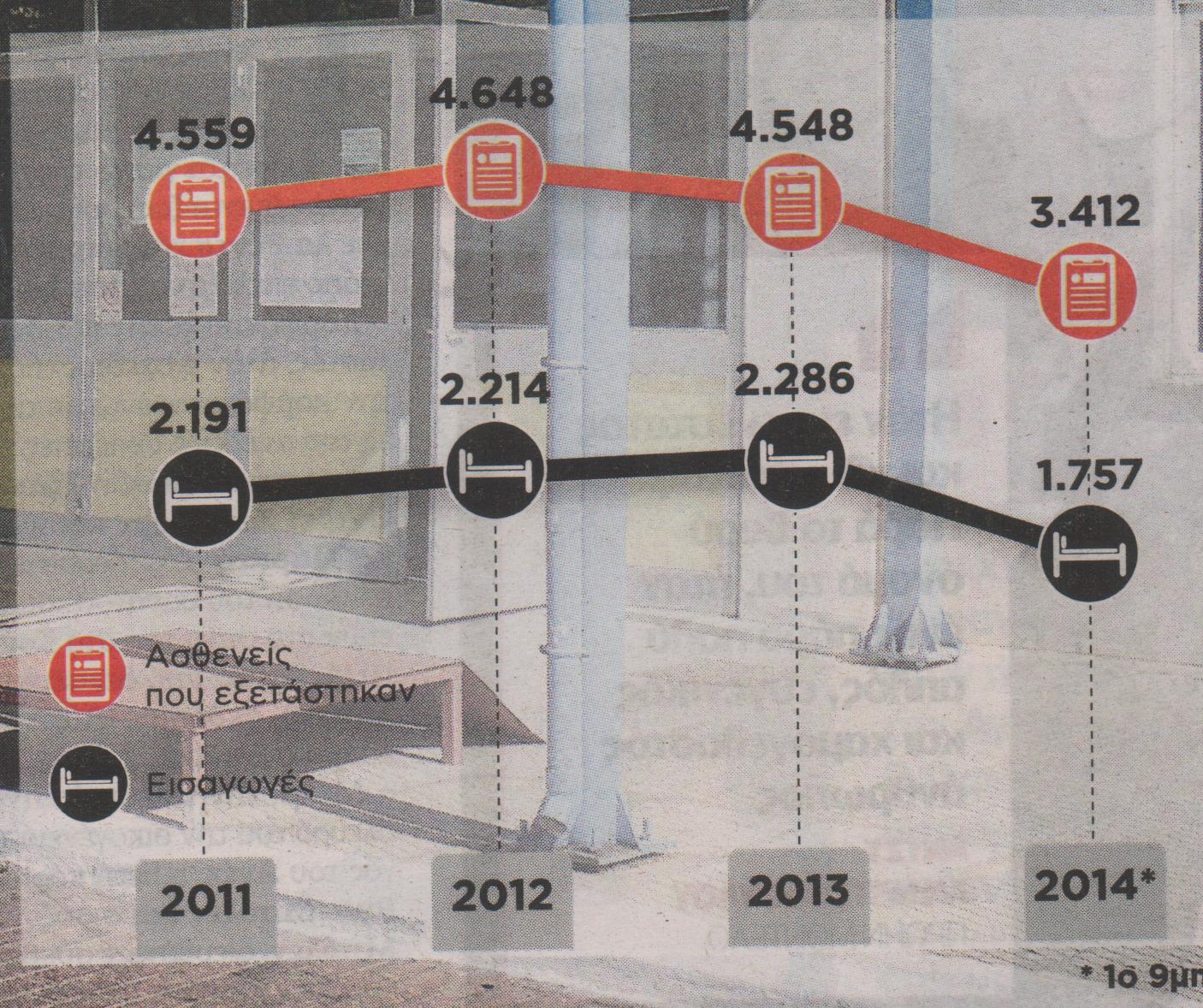 Μόνο στο Ψυχιατρικό Νοσοκομείο στο Δαφνί το 2014 γίνονται κάθε μήνα 200 εισαγωγές ασθενών με την πληρότητα να αγγίζει κατά μέσο όρο το 130%. Το αποτέλεσμα είναι να υπάρχουν σε αρκετές κλινικές ακόμα και ράντζα στους διαδρόμους.