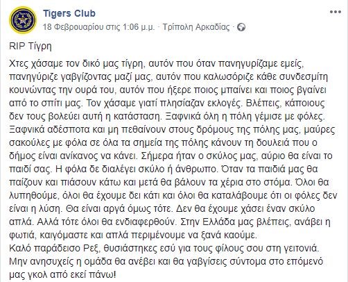 Τίγρη αποκαλούσαν τον σκύλο που συνόδευε την ομάδα του Αστέρα Τρίπολης παντού.Ήταν η μασκότ που δεν είχε χάσει αγώνα της ομάδας του στα εντός έδρας παιχνίδια και καθόταν στην εξέδρα. Όλοι τον λάτρευαν. Ήταν πάντα στο γήπεδο, στις νίκες και στις ήττες της ομάδας. Κάποιος ασυνείδητος πέταξε φαγητό με φόλα και θανάτωσε τον Ρεξ που ήταν το κανονικό του όνομα. Το όνομα του ήταν Ρεξ, ωστόσο οι φίλαθλοι του Αστέρα Τρίπολης τον αποκαλούσαν «τίγρη», Σε ανάρτηση των φιλάθλων της ομάδας tigers club, διατυπώνονται καταγγελίες: «Χτες χάσαμε τον δικό μας τίγρη, αυτόν που όταν πανηγυρίζαμε εμείς, πανηγύριζε γαβγίζοντας μαζί μας, αυτόν που καλωσόριζε κάθε συνδεσμίτη κουνώντας την ουρά του, αυτόν που ήξερε ποιος μπαίνει και ποιος βγαίνει από το σπίτι μας. Τον χάσαμε γιατί πλησίαζαν εκλογές. Βλέπεις, κάποιους δεν τους βολεύει αυτή η κατάσταση. Ξαφνικά όλη η πόλη γέμισε με φόλες. Ξαφνικά αδέσποτα και μη πεθαίνουν στους δρόμους της πόλης μας, μαύρες σακούλες με φόλα σε όλα τα σημεία της πόλης κάνουν τη δουλειά που ο δήμος είναι ανίκανος να κάνει. Σήμερα ήταν ο σκύλος μας, αύριο θα είναι το παιδί σας. Η φόλα δε διαλέγει σκύλο ή άνθρωπο. Όταν τα παιδιά μας θα παίζουν και πιάσουν κάτω και μετά θα βάλουν τα χέρια στο στόμα. Όλοι θα λυπηθούμε, όλοι θα έχουμε δει κάτι και όλοι θα καταλάβουμε ότι οι φόλες δεν είναι η λύση. Θα είναι αργά όμως τότε. Δεν θα έχουμε χάσει έναν σκύλο απλά. Αλλά τότε όλοι θα ενδιαφερθούν. Στην Ελλάδα μας βλέπεις, ανάβει η φωτιά, καιγόμαστε και απλά περιμένουμε να ξανάκαούμε. Καλό παράδεισο Ρεξ, θυσιάστηκες εσύ για τους φίλους σου στη γειτονιά. Μην ανησυχείς η ομάδα θα ανέβει και θα γαβγίσεις σύντομα στο επόμενό μας γκολ από εκεί πάνω!»