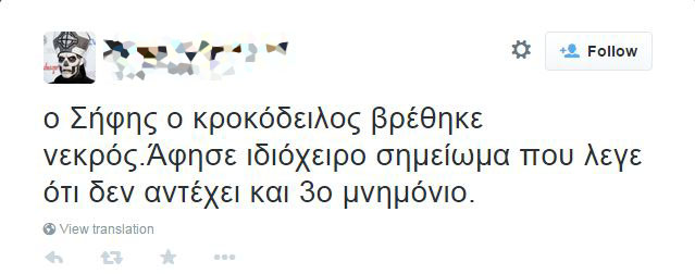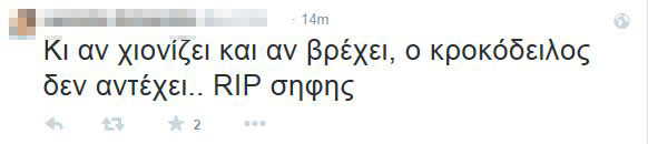 Ποικίλα σχόλια έχει προκαλέσει η είδηση θανάτου του Σήφη του κροκόδειλου, στο Twitter. Με χιούμορ οι χρήστες αποχαιρετούν το ερπετό, που για καιρό “τάραξε” τα νερά και τους πολίτες της Κρήτης, και έγινε αντικείμενο σχολιασμού σε όλη την Ελλάδα.