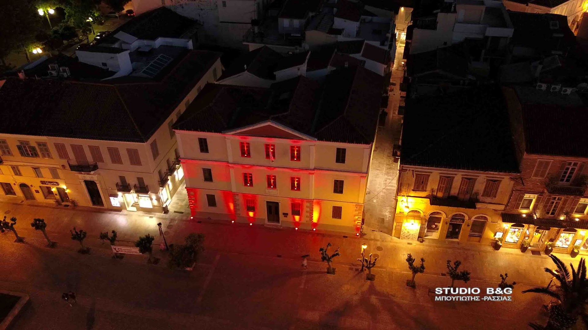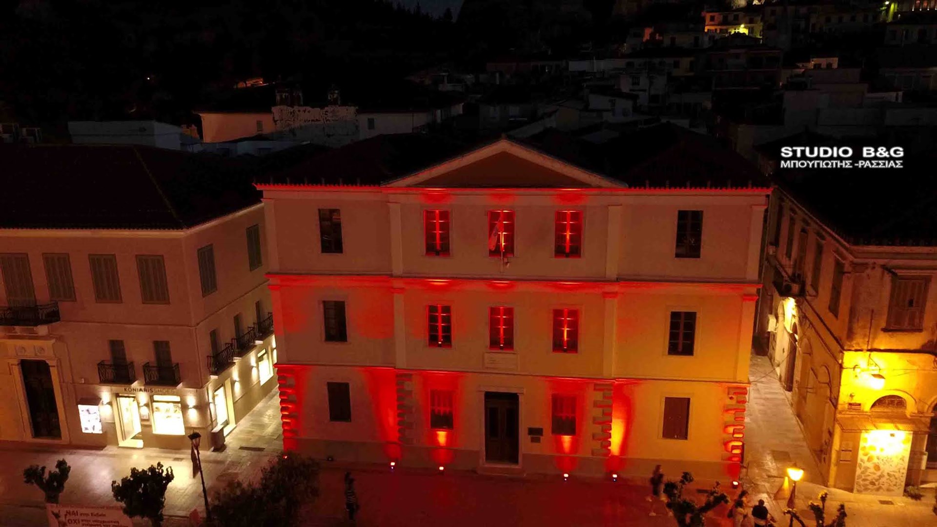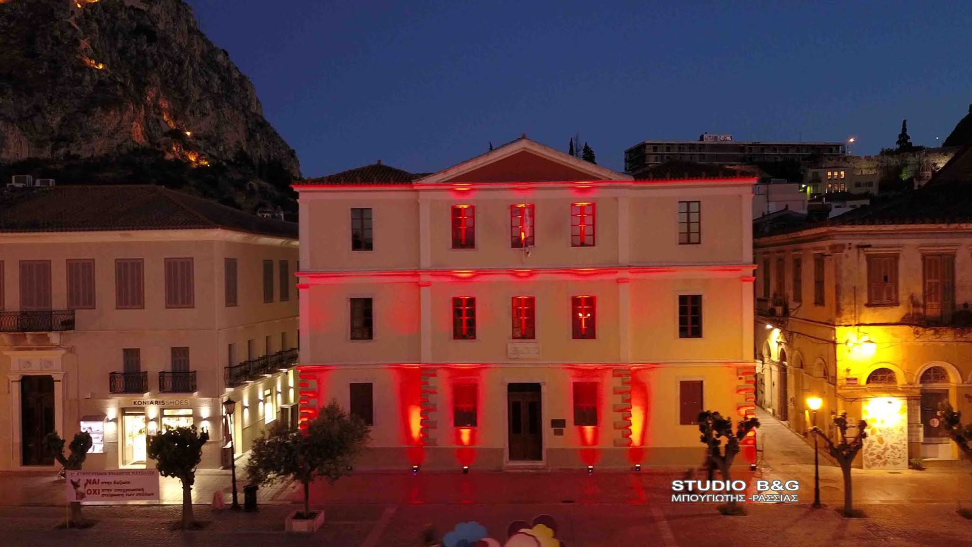 Στα κόκκινα φωταγωγήθηκε και το Δημαρχείο Ναυπλίου ως ελάχιστος φόρος τιμής στα θύματα της Ποντιακής Γενοκτονίας, όπως φαίνεται στις φωτογραφίες του argolikeseidhseis.gr.