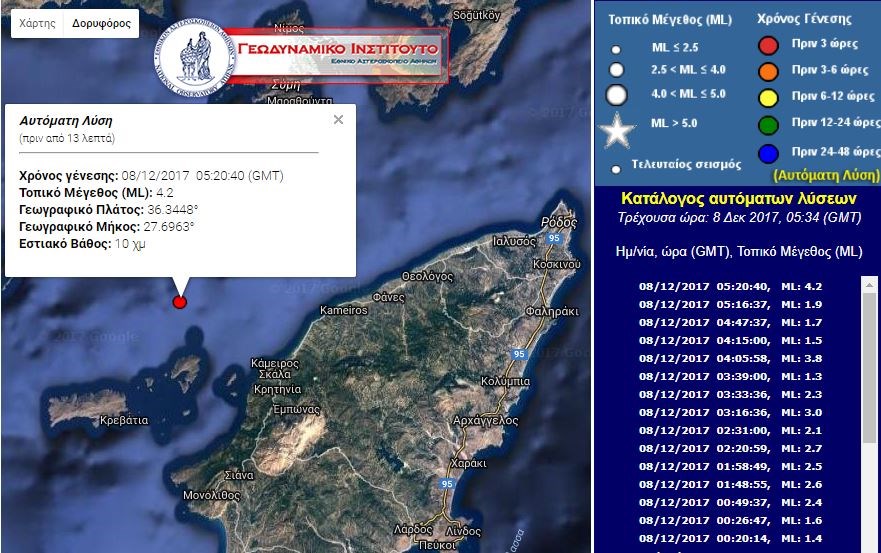 Σεισμός 4,2 Ρίχτερ έγινε στις 7:20 το πρωί της Παρασκευής, στη θαλάσσια περιοχή βόρεια της Ρόδου, σύμφωνα με την αυτόματη προκαταρκτική ανάρτηση του Γεωδυναμικού Ινστιτούτου.