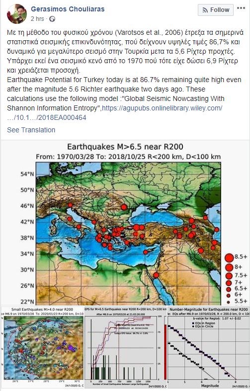 «Με την μέθοδο του φυσικού χρόνου (Varotsos et al., 2006) έτρεξα τα σημερινά στατιστικά σεισμικής επικινδυνότητας που δείχνουν υψηλές τιμές 86,7% για μεγαλύτερο σεισμό στην Τουρκία μετά τα 5,6 Ρίχτερ προχτές. Υπάρχει εκεί ένα σεισμικό κενό από το 1970 πού είχε δώσει 6,9 Ρίχτερ και χρειάζεται προσοχή».Δείτε την ανάρτηση: