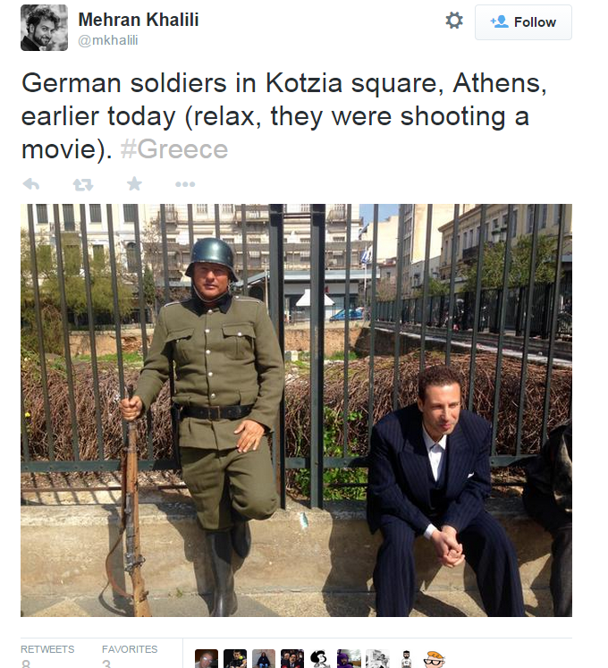 «Γερμανοί στρατιώτες στην πλατεία Κοτζιά, Αθήνα, νωρίτερα σήμερα. (Χαλαρώστε, γυρίζουν ταινία)», έγραψε ο Mehran Khalili.