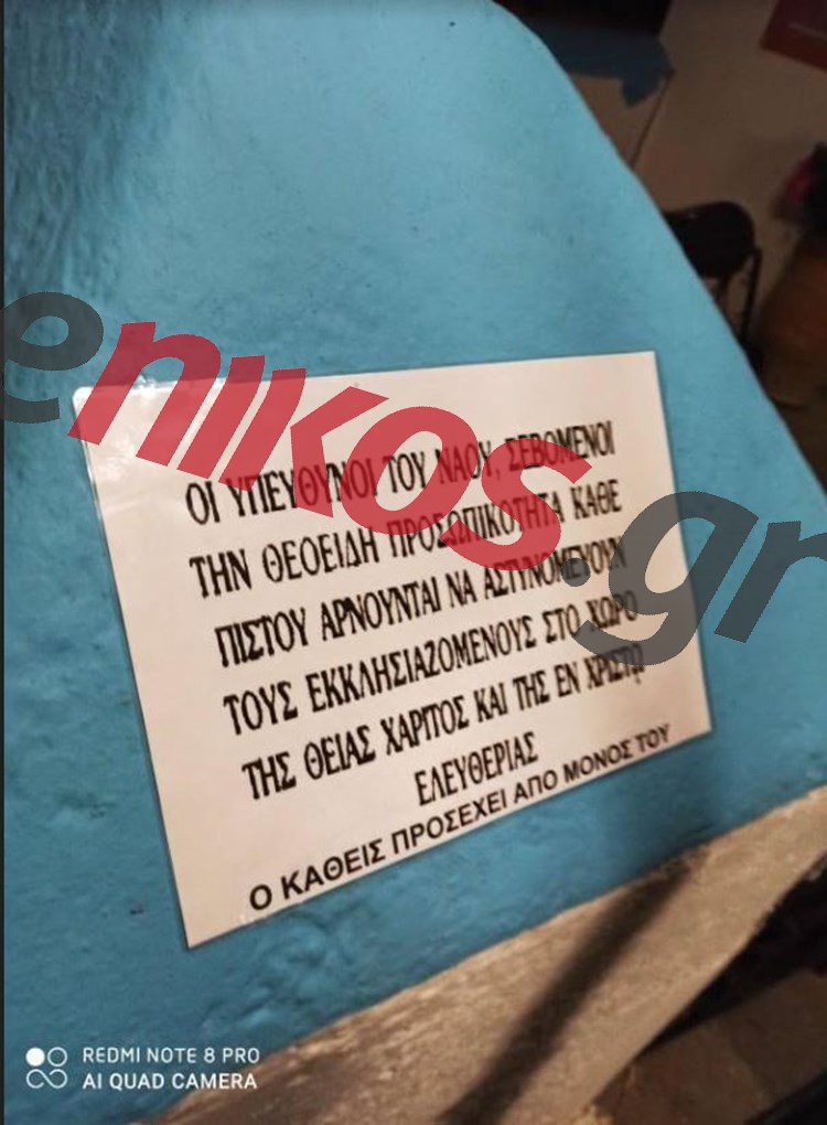 Οι υπεύθυνοι του ναού θέλησαν να γνωστοποιήσουν σε όλους τους πιστούς πως δεν έχουν καμία διάθεση να “αστυνομεύουν” για το αν τηρούνται τα μέτρα κατά της διασποράς του κορονοϊού κι έτσι συστήνουν σε κάθε πιστό να προσέχει… μόνος του. Μάλιστα έχουν εκτυπώσει σχετική ταμπέλα η οποία αναφέρει χαρακτηριστικά: