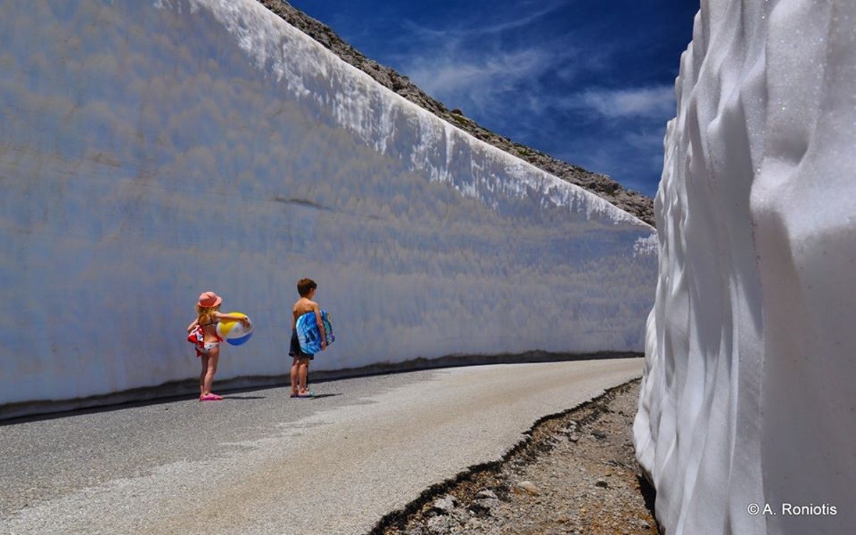 Το μεγαλείο της φύσης αποτυπώνει μια φωτογραφία που έχει γίνει viral. Όπως βλέπετε δύο μικρά παιδιά με εξοπλισμό για την παραλία βρίσκονται ανάμεσα σε τόνους από χιόνι. Το εντυπωσιακό της υπόθεσης είναι ότι η φωτογραφία τραβήχτηκε χθες, 13 Μαΐου στην Κρήτη και συγκεκριμένα στην περιοχή Σκίνακας του Ψηλορείτη.