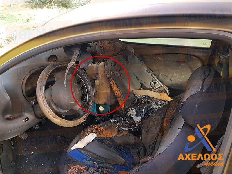 Πρόκειται για δύο φωτογραφίες τις οποίες έφερε στο φως το protothema.gr και το “Aχελώος media”, με την πρώτη να δείχνει το εσωτερικό του οχήματος και τη δεύτερη να το δείχνει απέξω στην πίσω πλευρά. Η πλέον σοκαριστική φωτογραφία είναι η πρώτη καθώς δείχνει καμένη τόσο τη θέση του οδηγού, όσο και του συνοδηγού.