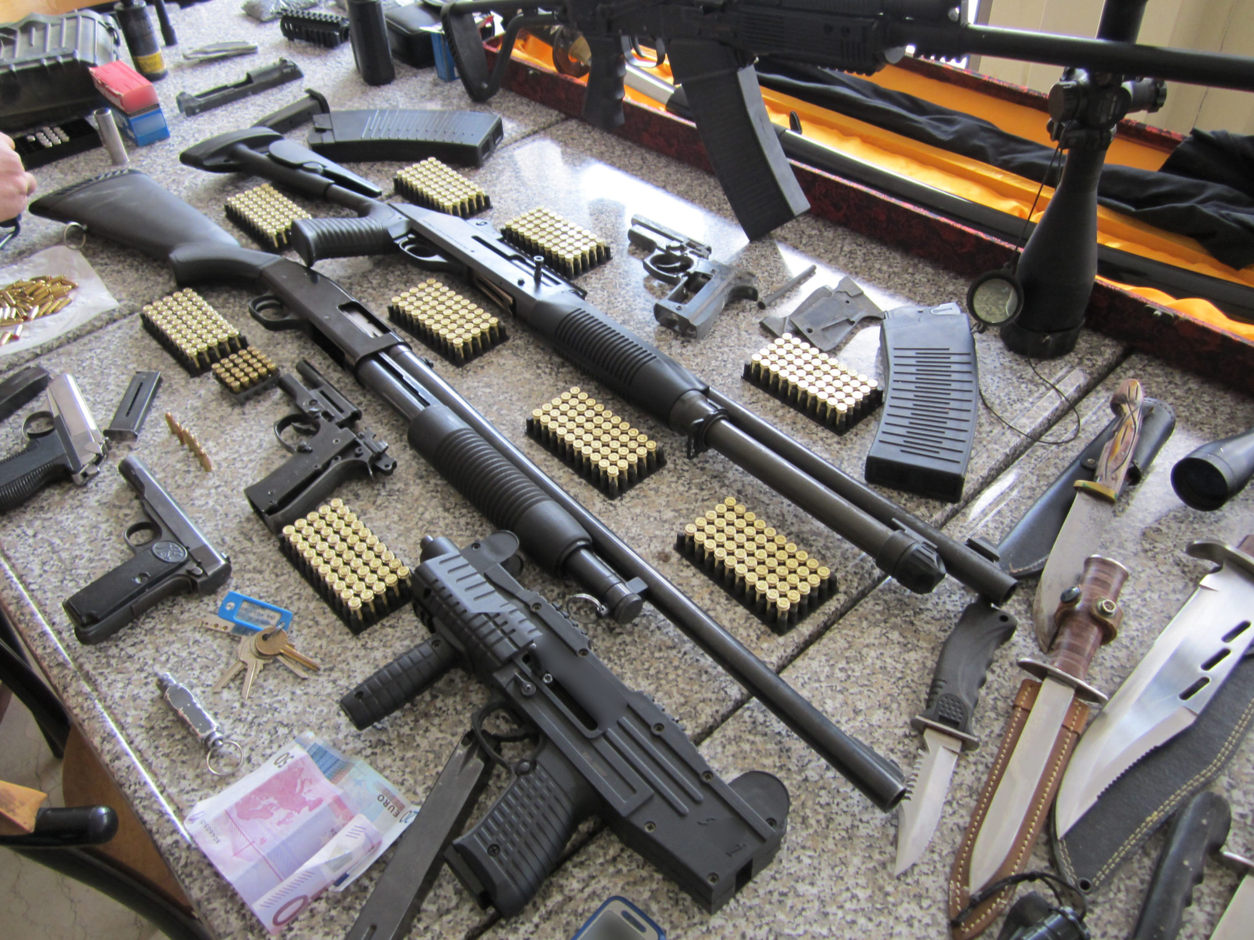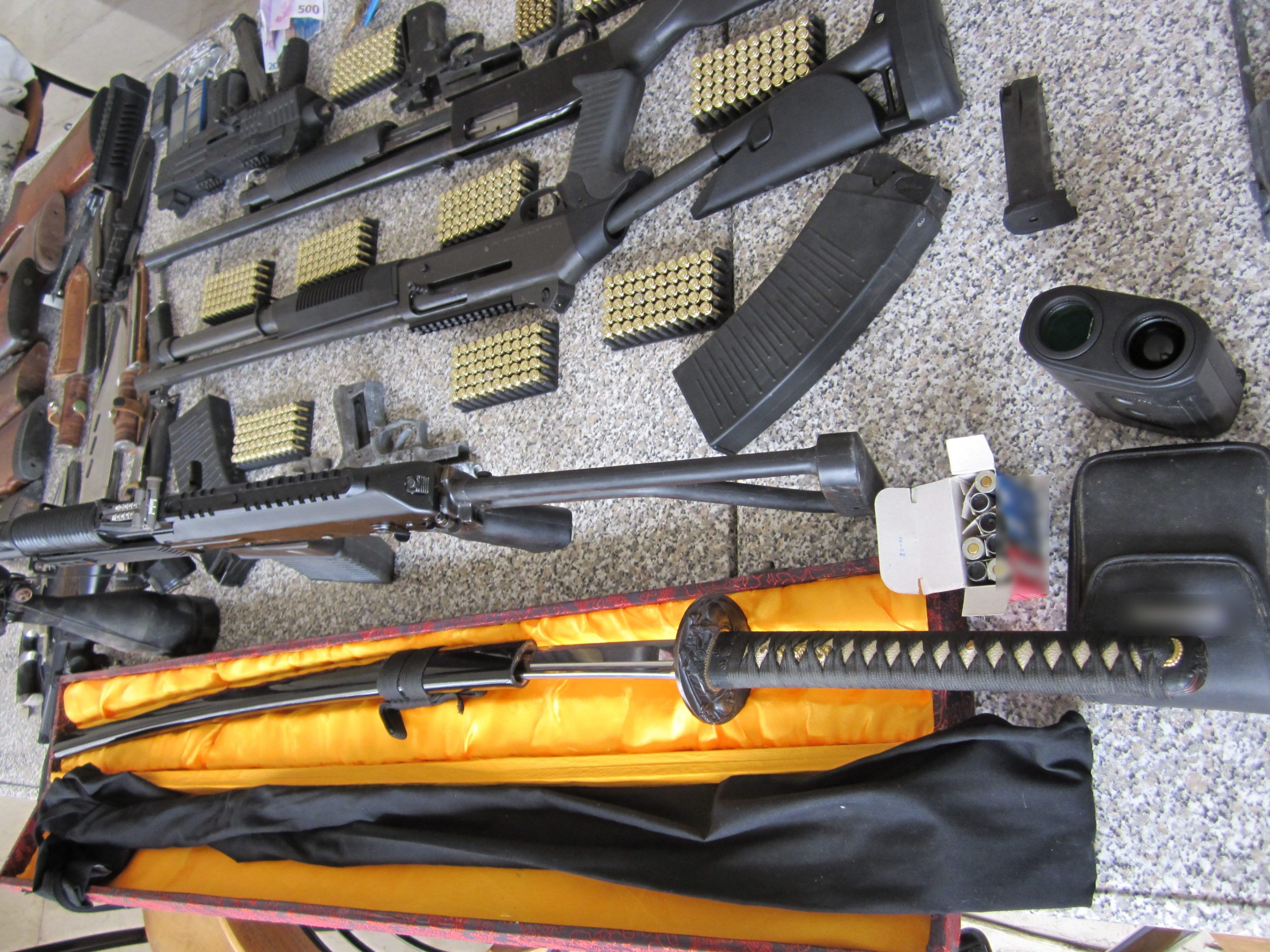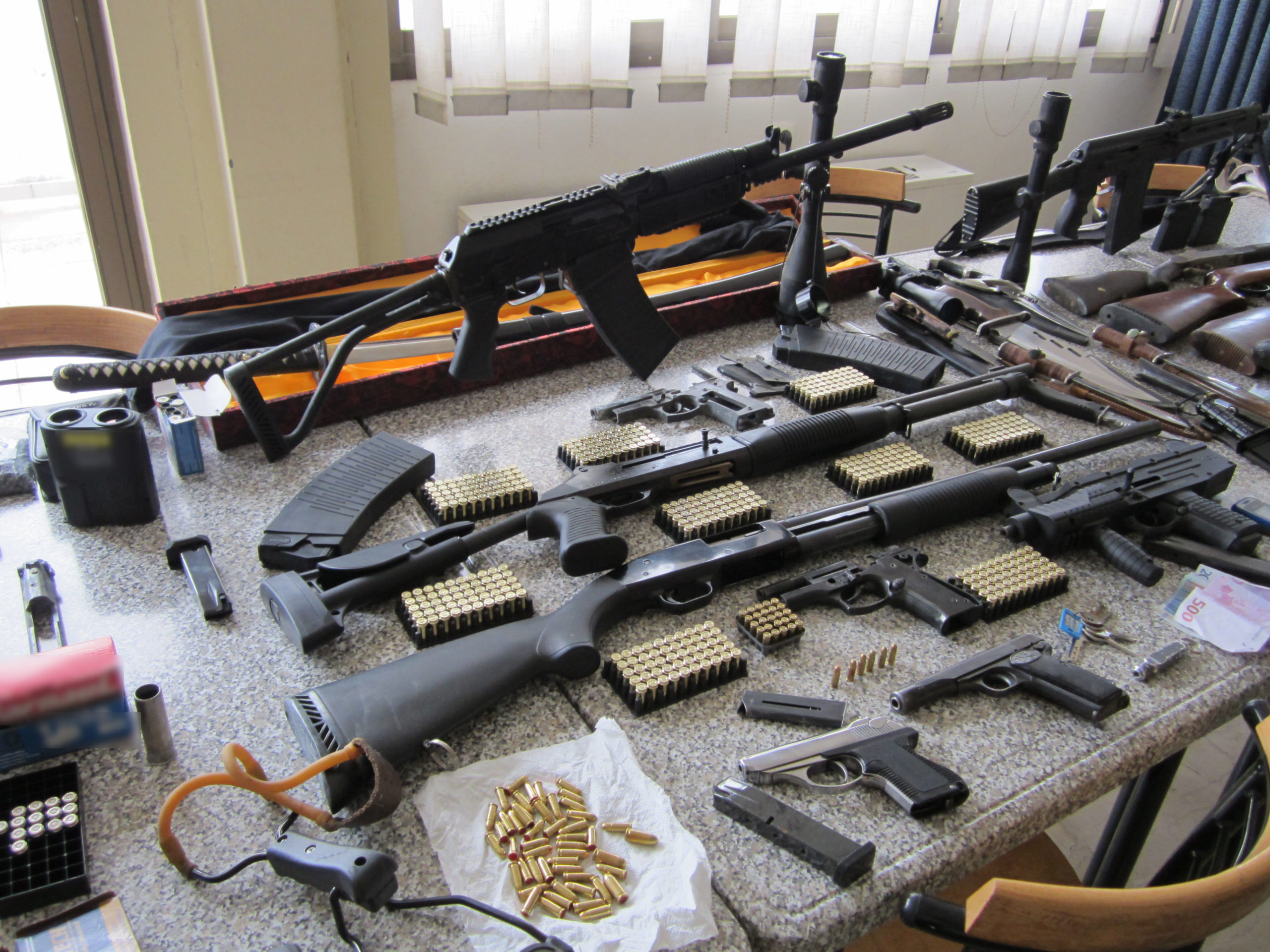 Στα δυο σπίτια που είχαν μετατραπεί σε αποθήκες οπλισμού βρέθηκαν έξι κυνηγετικά όπλα, δύο πιστόλια, ένα πιστόλι τύπου μπρελόκ, ένα ιαπωνικό ξίφος, ένα αλεξίσφαιρο γιλέκο, ένα τηλεσκόπιο, 549 φυσίγγια διαφόρων διαμετρημάτων, δυο κουκούλες τύπου full face
