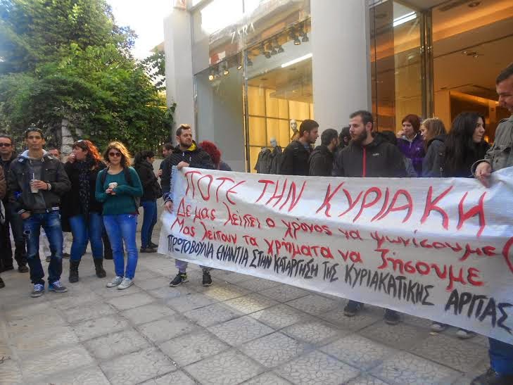 Οι συγκεντρωμένοι κρατούσαν πανό με συνθήματα «Όχι στην κατάργηση της κυριακάτικης αργίας» και «Ποτέ την Κυριακή».