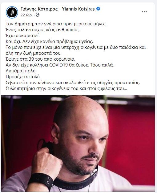 Όπως έγραψε συγκεκριμένα ο γνωστός καλλιτέχνης: “Τον Δημήτρη, τον γνώρισα πριν μερικούς μήνες. Ένας ταλαντούχος νέος άνθρωπος. Έχω σοκαριστεί. Και όχι. Δεν είχε κανένα πρόβλημα υγείας. Το μόνο που είχε είναι μία υπέροχη οικογένεια με δύο παιδάκια και όλη την ζωή μπροστά του. Έφυγε στα 39 του από κορωνοιό. Αν δεν είχε κολλήσει COVID19 θα ζούσε. Τόσο απλά. Λυπάμαι πολύ. Προσέχετε πολύ. Σεβαστείτε τον κίνδυνο και ακολουθείτε τις οδηγίες προστασίας. Συλλυπητήρια στην οικογένεια του και στους φίλους του…”.