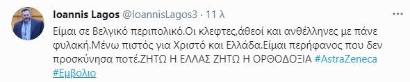 Σημειώνεται πως λίγες ώρες πριν από τη σύλληψη του Γιάννη Λαγού, η Ολομέλεια του Ευρωπαϊκού Κοινοβουλίου είχε αποφασίσει με συντριπτική πλειοψηφία την άρση της ασυλίας του ανοίγοντας έτσι τον δρόμο για τη σύλληψή του. Οι ελληνικές Αρχές άμεσα προχώρησαν στην έκδοση ευρωπαϊκού εντάλματος σύλληψης και ερυθράς αγγελίας μέσω ΙΝΤΕΡΠΟΛ με τις βελγικές Αρχές να ανταποκρίνονται άμεσα. Ο Γιάννης Λαγός συνεχίζοντας το επικοινωνιακό του παιχνίδι λίγο μετά τη σύλληψή του προχώρησε σε ανάρτηση στον λογαριασμό του στο twitter όπου έγραφε: “Είμαι σε βελγικό περιπολικό. Οι κλέφτες, άθεοι και ανθέλληνες με πάνε φυλακή. Μένω πιστός για Χριστό και Ελλάδα. Είμαι περήφανος που δεν προσκύνησα ποτέ. Ζήτω η Έλλας, ζήτω η Ορθοδοξία”.