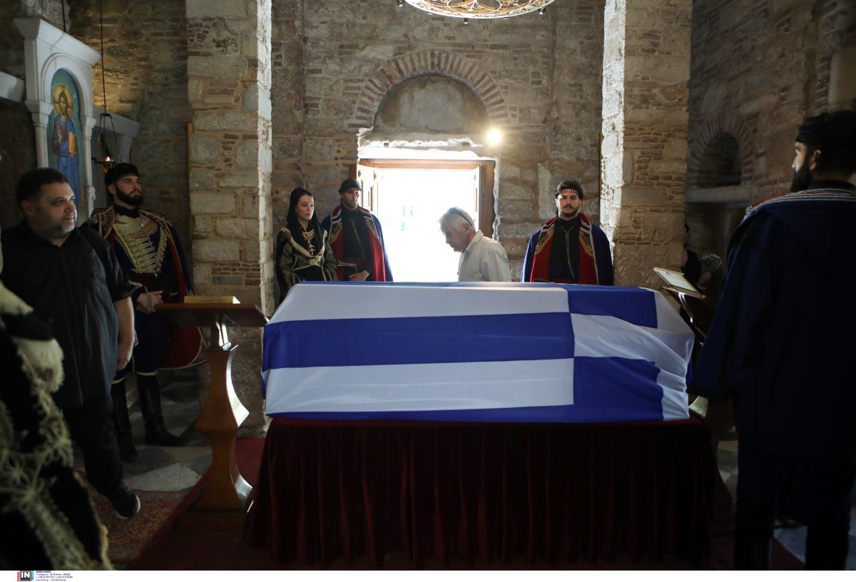 Τη σορό φυλάττουν, ως τιμητική φρουρά, Κουρήτες, με την παραδοσιακή κρητική φορεσιά.