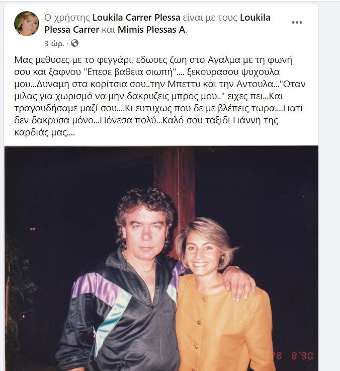 Ο θάνατος του Γιάννη Πουλόπουλο σκόρπισε θλίψη στον καλλιτεχνικό κόσμο και όχι μόνο. Η σύζυγος του Μίμη Πλέσσα, Λουκίλα Καρρέρ, τον αποχαιρέτησε με ένα συγκινητικό μήνυμα στο Facebook.