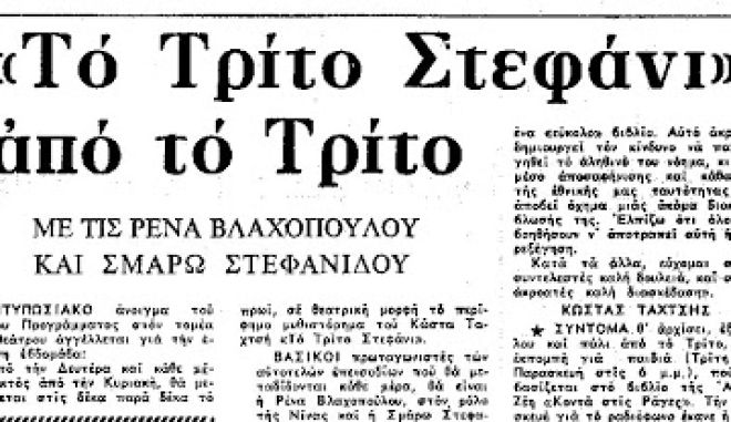 Την εποχή που το Τρίτο Πρόγραμμα της Ελληνικής Ραδιοφωνίας γινόταν το αγαπημένο μέσο φίλων του πολιτισμού, μετέδιδε εκπομπές και προγράμματα με ειδική αξία που οι ακροατές του δεν έχαναν με τίποτα. Μια τέτοια ήταν η ραδιοφωνική απόδοση του έργου ΤΟ ΤΡΙΤΟ ΣΤΕΦΑΝΙ του Κώστα Ταχτσή σε συνέχειες. Τους δύο ιστορικούς ρόλους της Νίνας και της Εκάβης έπαιζαν η Ρένα Βλαχοπούλου και η Σμάρω Στεφανίδου. Ο Γιώργος Παυριανός που είχε την επιμέλεια και τη σκηνοθεσία, αφηγήθηκε το 2008, πως προέκυψε αυτή η συνεργασία, αλλά και το έντονο παρασκήνιο της: