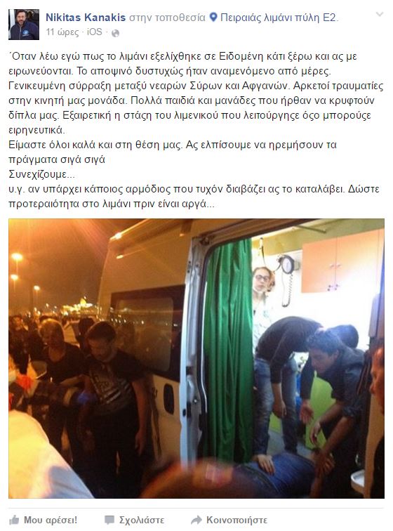 Τις χθεσινοβραδινές συμπλοκές μεταξύ νεαρών Σύρων και Αφγανών προσφύγων στο λιμάνι του Πειραιά, σχολιάζει με ανάρτηση στο Facebook, ο Νικήτας Κανάκης, επικεφαλής των Γιατρών του Κόσμου, επισημαίνοντας ότι το λιμάνι του Πειραιά εξελίχθηκε σε Ειδομένη.