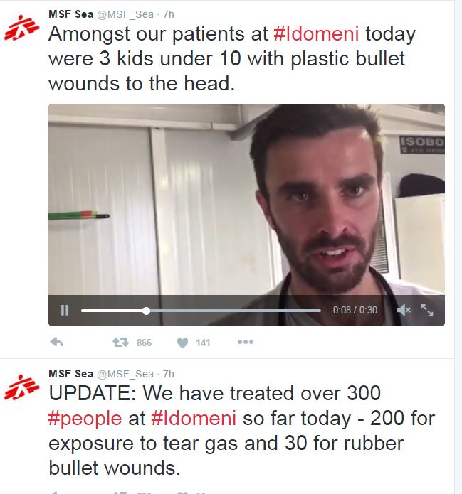 Η μαρτυρία ενός εθελοντή γιατρού της οργάνωσης που δημοσιεύτηκε, είναι συγκλονιστική και εξοργίζει. Όπως αναφέρει τρία παιδιά μεταφέρθηκαν με τραύματα στο κεφάλι από τις πλαστικές σφαίρες που έριξαν οι δυνάμεις των Σκοπίων. Και τα τρία τραυματισμένα παιδιά ήταν κάτω από 10 ετών.