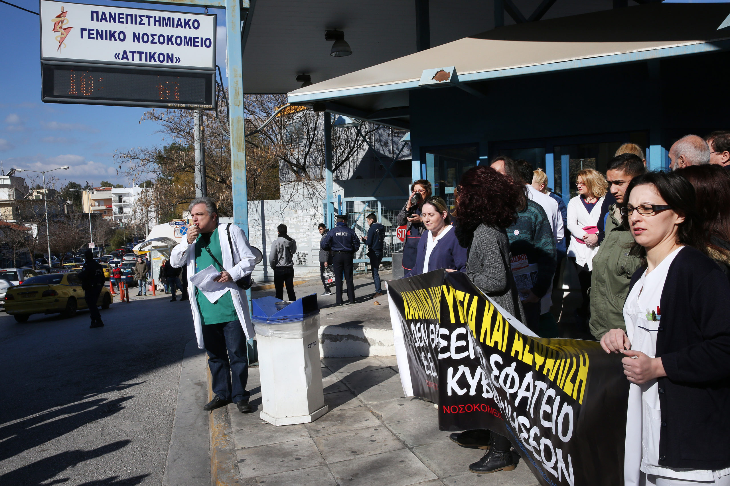 Οι εργαζόμενοι στο νοσοκομείο “Αττικόν”, όπως φαίνεται και στις φωτογραφίες, κρατούν πανό που γράφει “Καθολική Δημόσια Υγεία και Ασφάλιση” και φωνάζουν συνθήματα έξω από την είσοδο του νοσοκομείου, κατά τη διάρκεια της άφιξης του αναπληρωτή υπουργού Υγείας Παύλου Πολάκη.