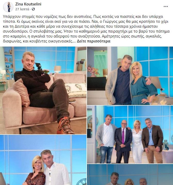 “Υπάρχουν στιγμές που νομίζεις πως δεν αναπνέεις. Πως κοιτάς να πιαστείς και δεν υπάρχει τίποτα. Κι όμως εκείνος είναι εκεί για να σε πιάσει. Ναι, ο Γιώργος μας θα μας κρατήσει το χέρι και τη Δευτέρα και κάθε μέρα να συνεχίσουμε τις αλήθειες που τέσσερα χρόνια ήμασταν συνοδοιπόροι. Ο στυλοβάτης μας. Ήταν το καθημερινό μας πειραχτήρι με το βαρύ του πάτημα στο καμαρίνι, η αγκαλιά του αδερφού που αναζητούσα. Αμέτρητες ώρες σιωπής, αγκαλιές, διαφωνίες, και κουβέντες οικογενειακές. Ήξερε να μας ηρεμεί, να μας οδηγεί, να αγαπά με ανιδιοτέλεια. Δεν θέλω να πιστέψω πως απέναντι μου δεν θα είναι το σκεπτικό του βλέμμα, με το χέρι στο πρόσωπο, και το χέρι βοηθείας σε μένα όταν με έβλεπε να λυγίζω… Και δεν ήταν λίγες οι φορές! Έχω την πεποίθηση και τη σιγουριά πως αυτό το χέρι και από Δευτέρα θα είναι εκεί στην άδεια του καρέκλα για να το αγγίζω όποτε το χρειάζομαι. Όποτε το χρειαζόμαστε. Ο Γιώργος είχε πάντα τον τρόπο να νικά το χρόνο, το ψέμα, τη δυσκολία. Πίστευε στη δύναμη της πένας, της αλήθειας, της έρευνας μέχρι τέλους!”, έγραψε στην ανάρτησή της στο Facebook η Ζήνα Κουτσελίνη.