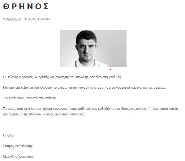 Η εν ψυχρώ εκτέλεση του Γιώργου Καραϊβάζ έχει σοκάρει το πανελλήνιο. Συντετριμμένοι είναι οι φίλοι και συνεργάτες του στο bloko.gr, που τον αποχαιρέτησαν με ένα συγκλονιστικό κείμενο στην ιστοσελίδα με τίτλο “Θρήνος”: