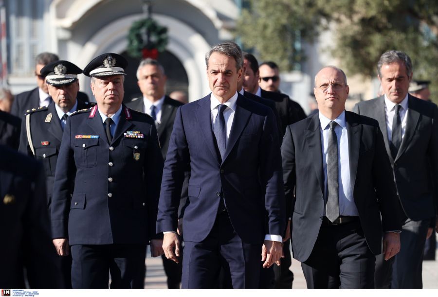 Απέναντι από την οικογένεια στέκεται ο πρωθυπουργός Κυριάκος Μητσοτάκης με τον υπουργό Προστασίας του Πολίτη Γιάννη Οικονόμου, τα σώματα ασφαλείας και πολιτικά και αυτοδιοικητικά πρόσωπα.