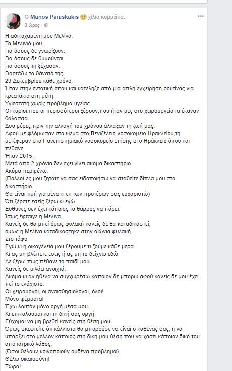 Ο πατέρας του άτυχου κοριτσιού συγκλονίζει με ανάρτησή του στο Facebook, στην οποία αναφέρεται στο χρονικό της τραγωδίας, επισημαίνει ότι δύο χρόνια μετά το θάνατο της δεν έχει γίνει ακόμα το δικαστήριο και ζητά άμεσα δικαιοσύνη.