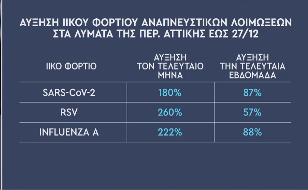 Αύξηση του ιικού φορτίου καταγράφηκε στα λύματα της Περιφέρειας Αττικής, με τον καθηγητή Αναλυτικής Χημείας, Νίκο Θωμαΐδη, να δηλώνει πως ««η πραγματικότητα δείχνει ότι τον τελευταίο μήνα είχαμε πολύ μεγάλη αύξηση στο γενικό φορτίο στα λύματα τόσο του κορονοϊού, όσο και άλλων αναπνευστικών ιών όπως η γρίπη τύπου Α και του συγκυτιακού ιού».