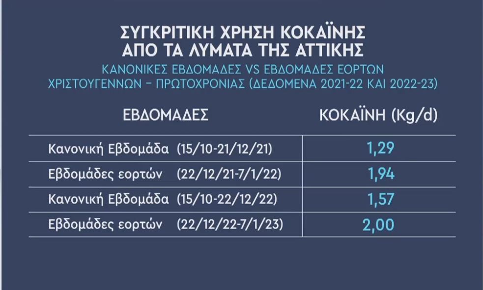 Αναλύοντας τα ενδιαφέροντα ευρήματα στα λύματα της Περιφέρειας Αττικής ο κ. Θωμαΐδης εστίασε στην αύξηση των ναρκωτικών ουσιών που παρατηρείται τις μέρες των εορτών.