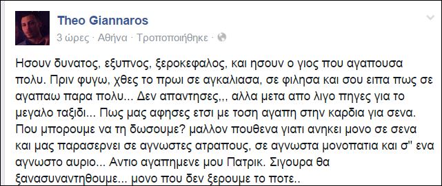 “Ήσουν δυνατός, έξυπνος, ξεροκέφαλος, και ήσουν ο γιος που αγαπούσα πολύ. Πριν φύγω, χθες το πρωί σε αγκάλιασα, σε φίλησα και σου είπα πως σε αγαπάω πάρα πολύ… Δεν απάντησες,,, αλλά μετά από λίγο πήγες για το μεγάλο ταξίδι… Πως μας άφησες έτσι με τόση αγάπη στην καρδιά για σένα. Που μπορούμε να τη δώσουμε? μάλλον πουθενά γιατί ανήκει μόνο σε σένα και μας παρασέρνει σε άγνωστες ατραπούς, σε άγνωστα μονοπάτια και σ” ένα άγνωστο αύριο… Αντίο αγαπημένε μου Πάτρικ. Σίγουρα θα ξανασυναντηθούμε… μόνο που δεν ξέρουμε το πότε..” έγραψε σε άλλη ανάρτηση ενώ πριν από η τελευταία του ανέφερε: