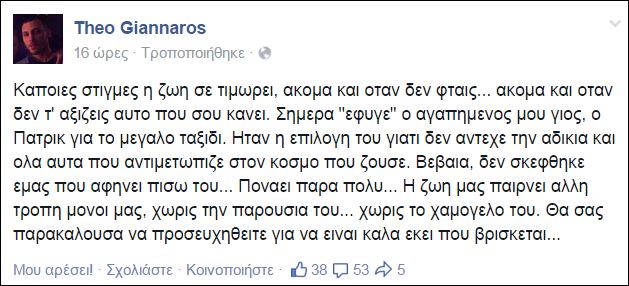 “Κάποιες στιγμές η ζωή σε τιμωρεί, ακόμα και όταν δεν φταις… ακόμα και όταν δεν τ’ αξίζεις αυτό που σου κάνει. Σήμερα “έφυγε” ο αγαπημένος μου γιος, ο Πάτρικ για το μεγάλο ταξίδι. Ήταν η επιλογή του γιατί δεν άντεχε την αδικία και όλα αυτά που αντιμετώπιζε στον κόσμο που ζούσε. Βέβαια, δεν σκέφθηκε εμάς που αφήνει πίσω του… Πονάει πάρα πολύ… Η ζωή μας παίρνει άλλη τροπή μονοί μας, χωρίς την παρουσία του… χωρίς το χαμόγελο του. Θα σας παρακαλούσα να προσευχηθείτε για να είναι καλά εκεί που βρίσκεται…” έγραψε ο κ. Γιάνναρος στο προφίλ του στο Facebook, ανεβάζοντας και τη φωτογραφία του γιου του.