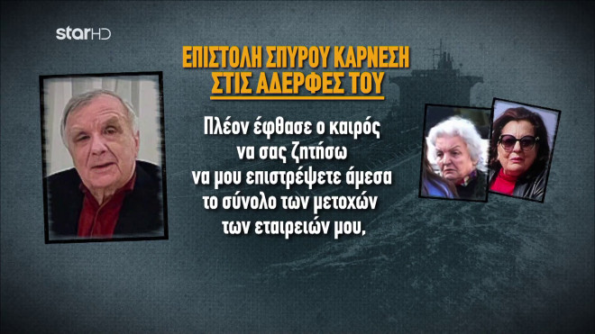 Νέα στοιχεία για τη δικαστική διένεξη ανάμεσα στα αδέλφια της οικογένειας Καρνέση έρχονται στο φως της δημοσιότητας. Στο κεντρικό δελτίο ειδήσεων του Star, λίγες μέρες μετά το μακελειό στην Γλυφάδα, παρουσιάστηκε η επιστολή του Σπύρου Καρνέση, που έστειλε τον περασμένο Μάιο στις αδελφές του, για να του επιστρέψουν τις μετοχές.