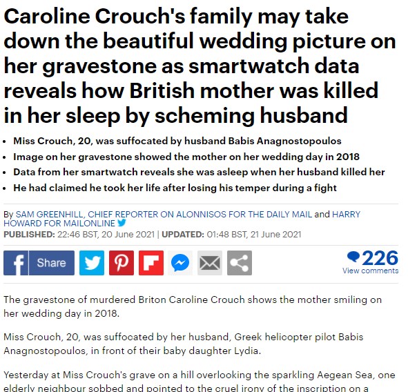 Η φωτογραφία που επέλεξε η οικογένεια της Καρολάιν να μπει στον τάφο της, είναι από την ημέρα του γάμου της το 2018. Όπως δήλωσε μια γειτόνισσα της μητέρας της άτυχης 20χρονης, που δολοφονήθηκε από τον σύζυγό της, Μπάμπη Αναγνωστόπουλο, μπροστά στα μάτια της κόρης τους, Λυδίας, “είναι τραγική ειρωνία, όταν έγινε η κηδεία δεν γνωρίζαμε”.