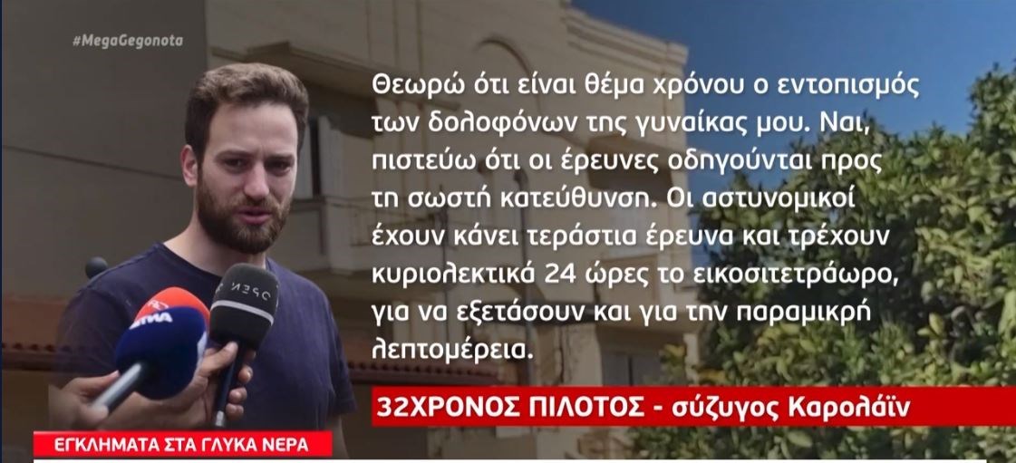 «Περιμένω κάθε μέρα νέα τους. Σας ευχαριστώ για το ενδιαφέρον σας, όπως και να έχει, να είστε όλοι καλά», είχε υποστηρίξει ακόμη ο σύζυγος της 20χρονης Καρολάιν. Για να σπεύσει το απόγευμα στο Mega να μιλήσει ξανά για την αμέριστη εμπιστοσύνη που έχει στους αξιωματικούς της ΕΛ.ΑΣ. για τον χειρισμό της υπόθεσης υπογραμμίζοντας ταυτόχρονα το πόσο σημαντικό είναι να μην διαρρέονται πληροφορίες που θα μπορούσαν να βλάψουν τις έρευνες ή να παραπλανήσουν τις Αρχές. «Είναι απίστευτη στήριξη που έχω λάβει τις τελευταίες ημέρες. Αναγνωρίζω πόσο πολύ θέλει ο κόσμος να βοηθήσει. Σας ευχαριστώ όλους», δήλωνε ο 32χρονος.