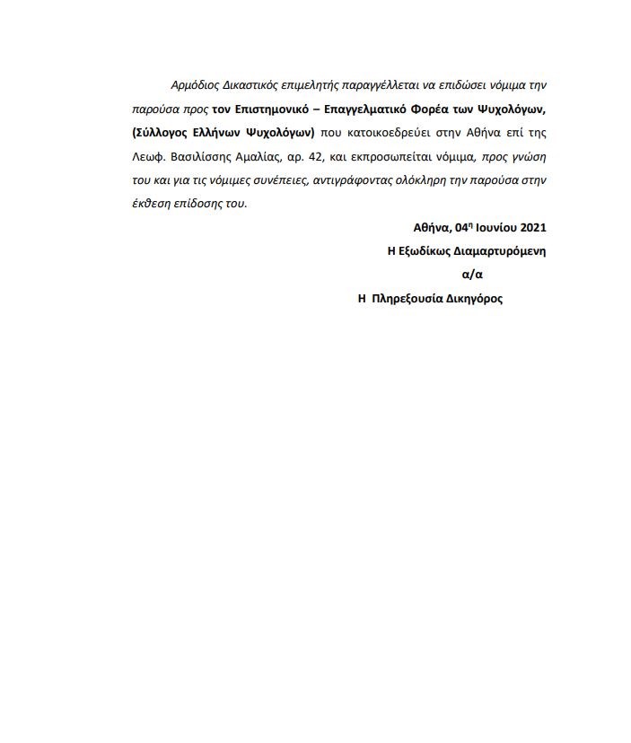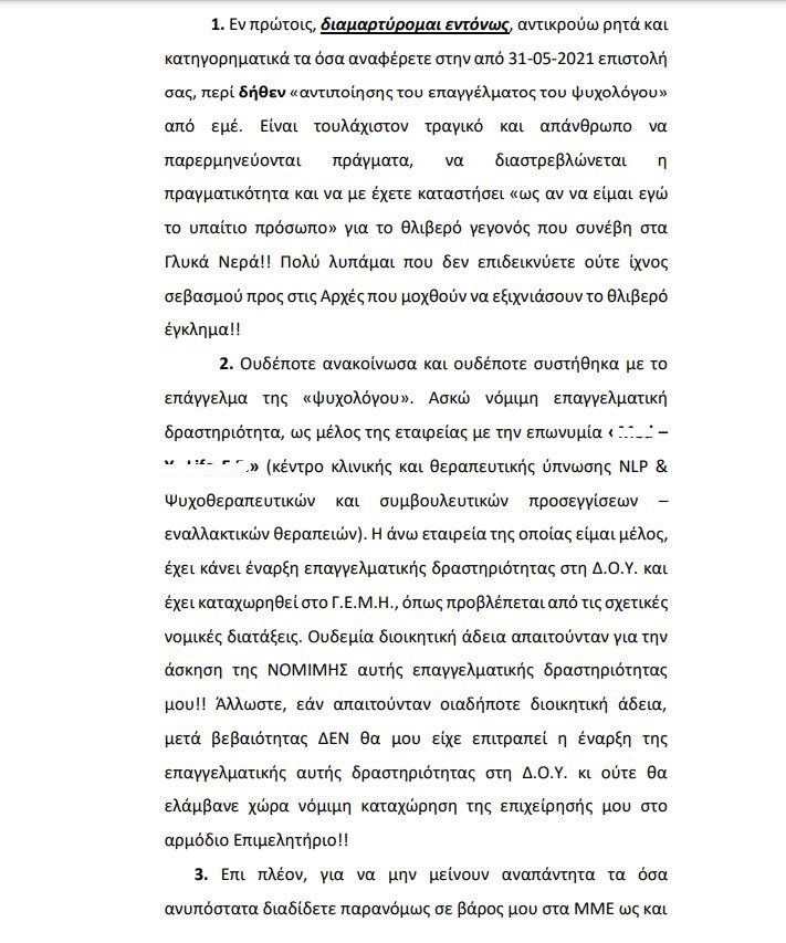 Παράλληλα διαμαρτύρεται εντόνως, “αντικρούοντας ρητά και κατηγορηματικά τα όσα αναφέρετε στην από 31-05-2021 επιστολή σας, περί δήθεν “αντιποίησης του επαγγέλματος του ψυχολόγου” από εμέ” ενώ , μεταξύ άλλων, σημειώνει πως “ουδέποτε ανακοίνωσα και ουδέποτε συστήθηκα με το επάγγελμα της “ψυχολόγου”. Ασκώ νόμιμη επαγγελματική δραστηριότητα”.