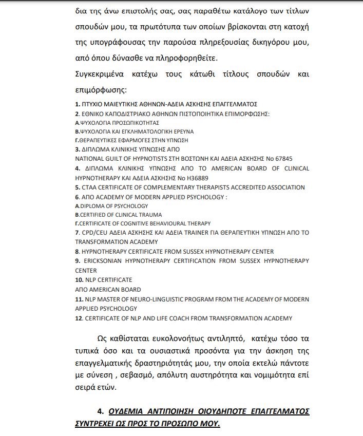 - Από την εξώδικη απάντησή της προς τον ΣΕΨ προκύπτει οτι δεν έχει πτυχίο ΑΕΙ Ψυχολογίας , ούτε Αδεια άσκησης επαγγέλματος Ψυχολόγου.