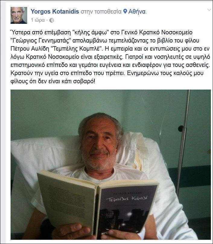 Ο ηθοποιός ανέβασε μια φωτογραφία στον προσωπικό του λογαριασμό στο Facebook μέσα από το νοσοκομείο, όπου νοσηλεύεται, όμως, φρόντισε αμέσως να καθησυχάσει τους διαδικτυακούς του φίλους και τους θαυμαστές.Πρόκειται για τον Γιώργο Κοτανίδη, ο οποίος υπεβλήθη σε επέμβαση κήλης στο «Γεώργιος Γεννηματάς» και ενημέρωσε τους φίλους του ότι δεν είναι κάτι σοβαρό. Αναλυτικά το σχόλιο του: «Ύστερα από επέμβαση “κήλης άμφω” στο Γενικό Κρατικό Νοσοκομείο “Γεώργιος Γεννηματάς” απολαμβάνω τεμπελιάζοντας το βιβλίο του φίλου Πέτρου Αυλίδη “Τεμπέλης Κομπλέ”. Η εμπειρία και οι εντυπώσεις μου στο εν λόγω Κρατικό Νοσοκομείο είναι εξαιρετικές. Γιατροί και νοσηλευτές σε υψηλό επιστημονικό επίπεδο και γεμάτοι ευγένεια και ενδιαφέρον για τους ασθενείς. Κρατούν την υγεία στο επίπεδο που πρέπει. Ενημερώνω τους καλούς μου φίλους ότι δεν είναι κάτι σοβαρό!».