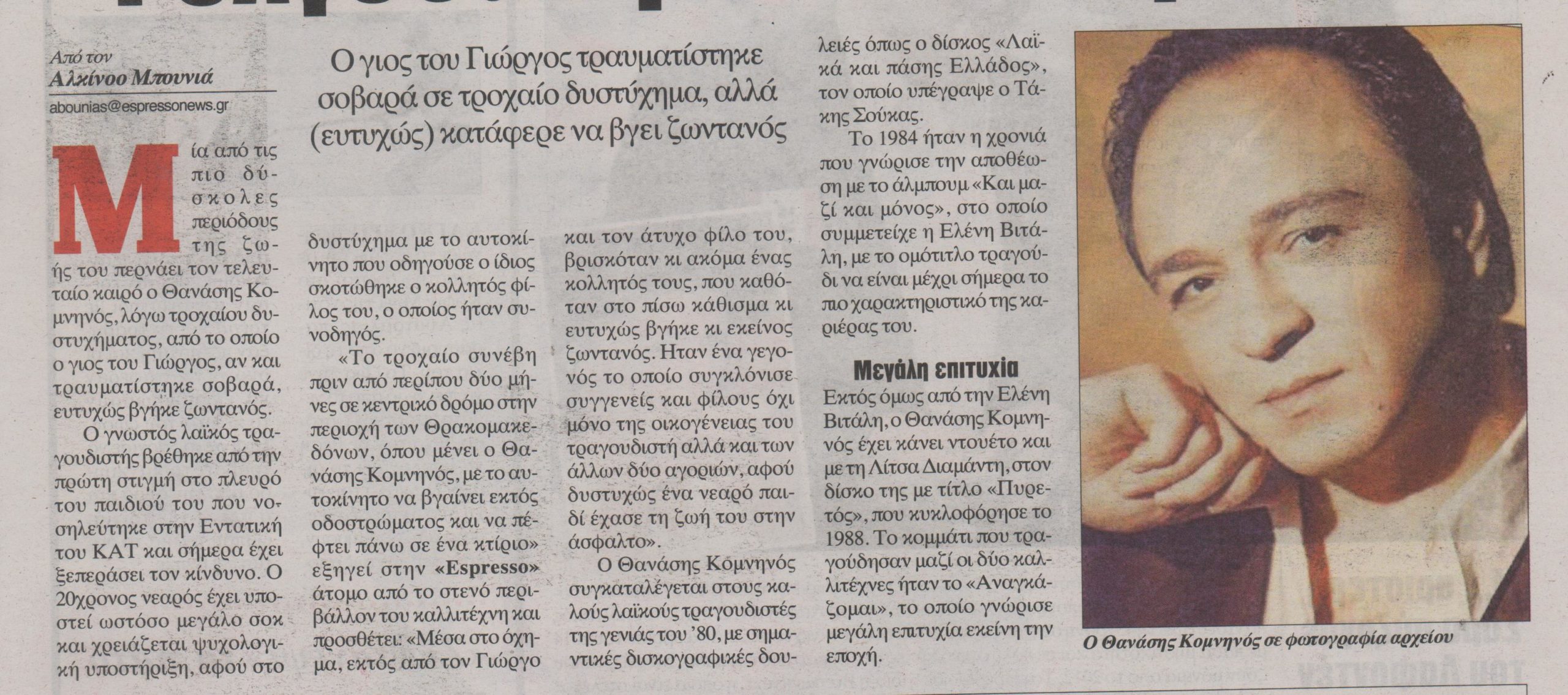 Μία από τις πιο δύσκολες περιόδους της ζωής του περνάει τον τελευταίο καιρό ο λαϊκός τραγουδιστής Θανάσης Κομνηνός, λόγω τροχαίου, από το οποίο ο γιος του Γιώργος, αν και τραυματίστηκε σοβαρά, ευτυχώς βγήκε ζωντανός.