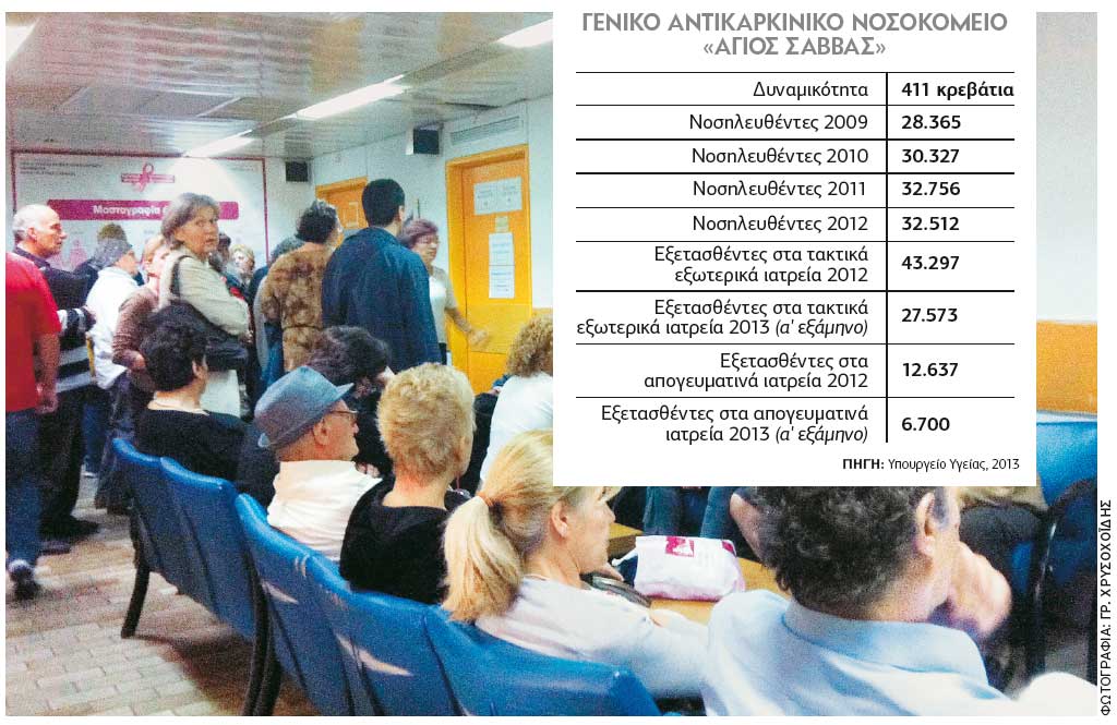 Σύμφωνα με στοιχεία του υπουργείου Υγείας, η νοσηλευτική κίνηση έχει εκτιναχθεί την τελευταία τριετία φτάνοντας το 2012 τους 32.512 νοσηλευθέντες, από 28.365 το 2009. Η οικονομική κρίση έχει παίξει το ρόλο της, καθώς χιλιάδες καρκινοπαθείς δεν είναι σε θέση να πληρώσουν στον ιδιωτικό τομέα για επίσκεψη ή θεραπεία.