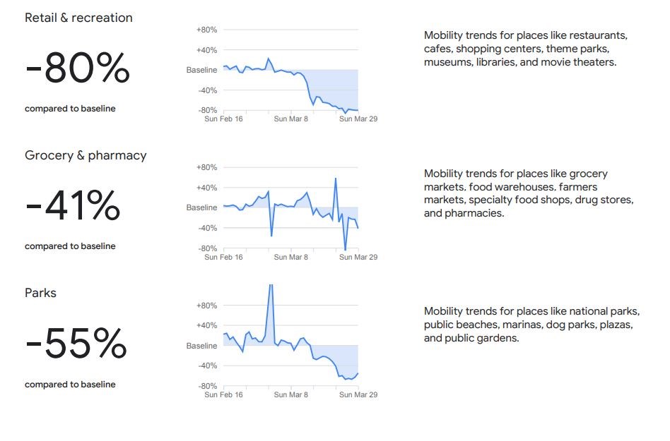 Για την Ελλάδα ειδικά, η Google αναφέρει ότι μεταξύ των αρχών Ιανουαρίου και του τέλους Μαρτίου έχει υπάρξει μείωση κατά 80% στις κινήσεις στο τομέα λιανικού εμπορίου και αναψυχής (καταστήματα, εστιατόρια, καφέ, πάρκα, μουσεία, βιβλιοθήκες, σινεμά, θέατρα κ.ά.), μείωση 76% στον τομέα μέσων μαζικής μεταφοράς (μετρό, λεωφορεία, τρένα κ.ά.), μείωση 55% στα πάρκα-παραλίες-πλατείες-μαρίνες, μείωση 53% προς τους χώρους εργασίας και μείωση 41% στα καταστήματα τροφίμων-λαϊκές αγορές-φαρμακεία. Αντίθετα έχει υπάρξει αύξηση της κινητικότητας κατά 20% στους χώρους κατοικίας.