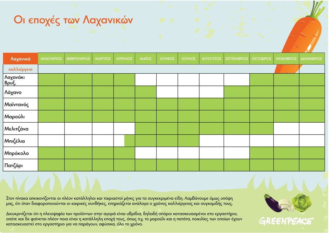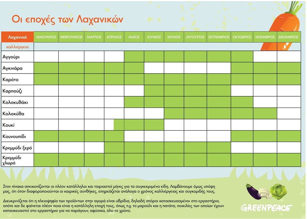 Η Greenpeace έφτιαξε έναν αναλυτικό πίνακα για τα πιο κοινά φρούτα και λαχανικά και πότε είναι η εποχή τους μέσα στο χρόνο.