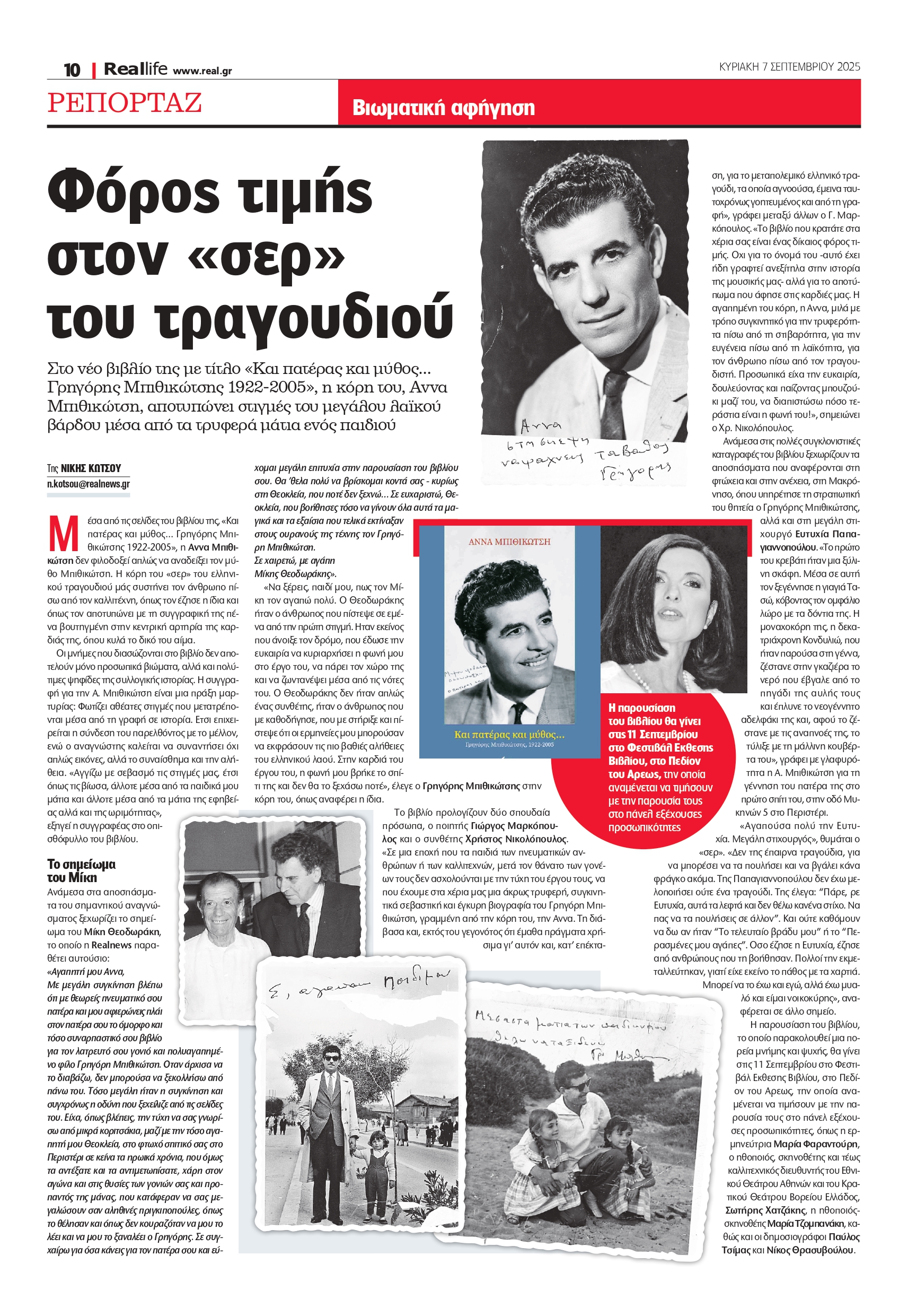 Μέσα από τις σελίδες του βιβλίου της, «Και πατέρας και μύθος… Γρηγόρης Μπιθικώτσης 1922-2005», η Άννα Μπιθικώτση δεν φιλοδοξεί απλώς να αναδείξει τον μύθο Μπιθικώτση. Η κόρη του «σερ» του ελληνικού τραγουδιού μάς συστήνει τον άνθρωπο πίσω από τον καλλιτέχνη, όπως τον έζησε η ίδια και όπως τον αποτυπώνει με τη συγγραφική της πένα βουτηγμένη στην κεντρική αρτηρία της καρδιάς της, όπου κυλά το δικό του αίμα. Οι μνήμες που διασώζονται στο βιβλίο δεν αποτελούν μόνο προσωπικά βιώματα, αλλά και πολύτιμες ψηφίδες της συλλογικής ιστορίας. Η συγγραφή για την Α. Μπιθικώτση είναι μια πράξη μαρτυρίας: Φωτίζει αθέατες στιγμές που μετατρέπονται μέσα από τη γραφή σε ιστορία. Έτσι επιχειρείται η σύνδεση του παρελθόντος με το μέλλον, ενώ ο αναγνώστης καλείται να συναντήσει όχι απλώς εικόνες, αλλά το συναίσθημα και την αλήθεια. «Αγγίζω με σεβασμό τις στιγμές μας, έτσι όπως τις βίωσα, άλλοτε μέσα από τα παιδικά μου μάτια και άλλοτε μέσα από τα μάτια της εφηβείας αλλά και της ωριμότητας», εξηγεί η συγγραφέας στο οπισθόφυλλο του βιβλίου.